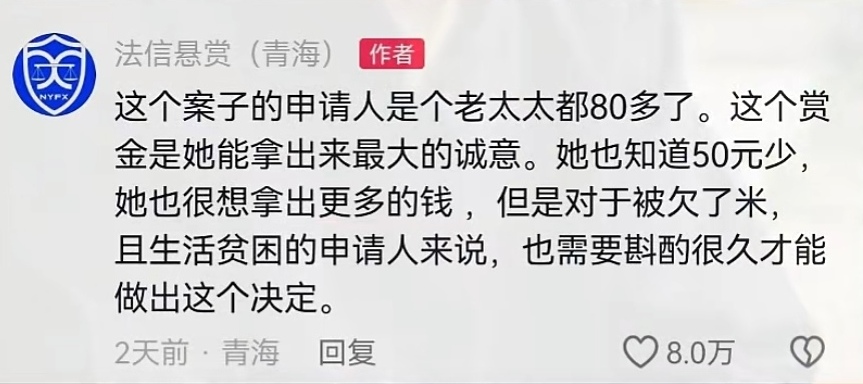 针对网友们对于悬赏奖金仅为50元的讨论,“法信悬赏(青海)”账号在评论区回复:“这个案子的申请人是个80多岁的老太太,这个赏金是她能拿出来最大的诚意。”