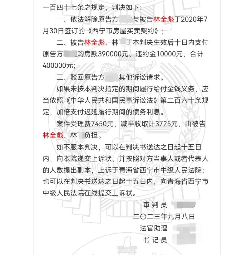 对此,青海省西宁市城东区人民法院最终判决,依法解除方某与林全彪签订的《西宁市房屋买卖契约》。被告林全彪父子在判决生效后十日内支付方某购房款39万元、违约金1万元,合计40万元。