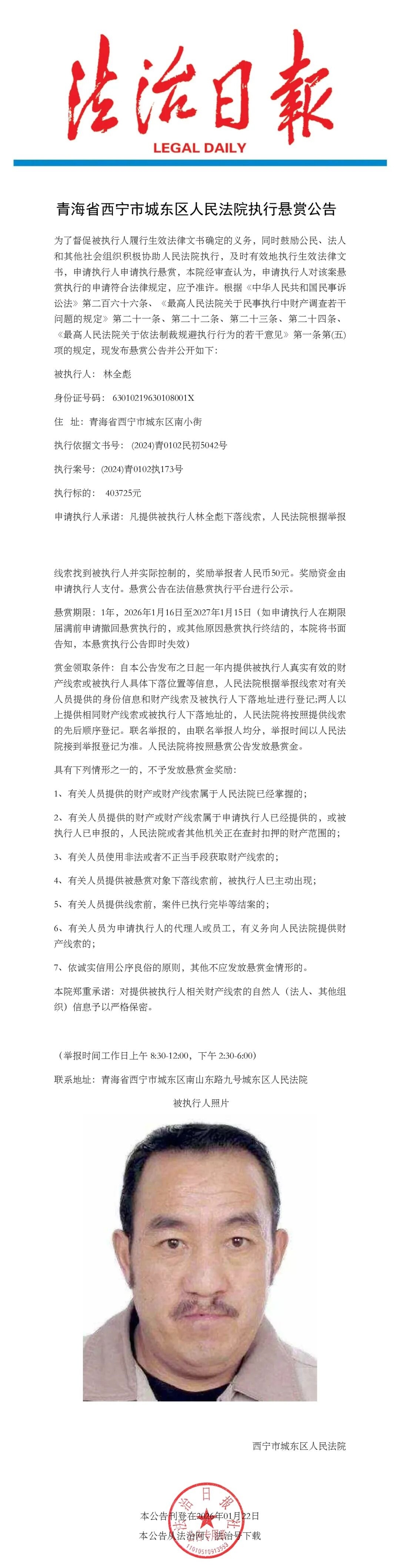 “法信悬赏(青海)”发布的悬赏公告显示,执行法院为青海省西宁市城东区人民法院,被执行人为林全彪,其地址为青海省西宁市城东区南小街。